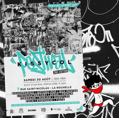 Né en 2024 de l’association des commerçants du quartier Saint‑Nicolas et du street‑artiste rochelais Super Bourdi, le festival Kissycol revient pour une deuxième édition le samedi 30 août 2025, de 10 h à 19h.