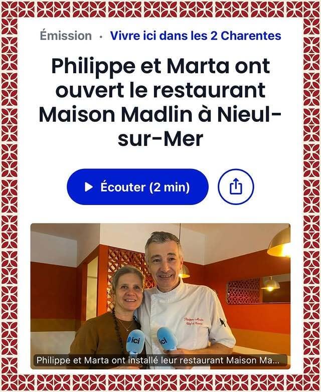 Philippe et Marta ont ouvert Maison Madlin à Nieul‑sur‑Mer, un restaurant où se rencontrent la cuisine traditionnelle française et des inspirations latines. Philippe, qui a commencé en cuisine dès l’adolescence et est passé par des tables étoilées, et Marta, issue du marketing et de la mode, y partagent leur passion commune pour l’hospitalité.