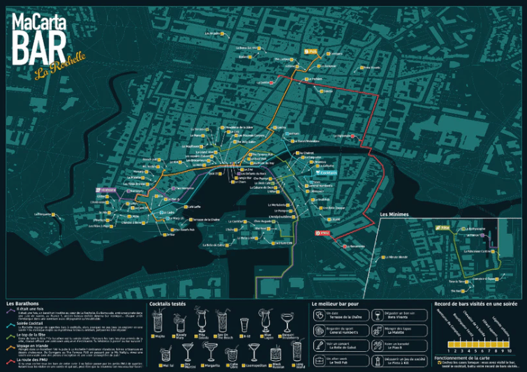 Glenn Louarn a eu l'excellente idée de lancer un poster recensant 90 bars de La Rochelle, transformant la ville en un plan de métro pour les amateurs de sorties. Soif !
